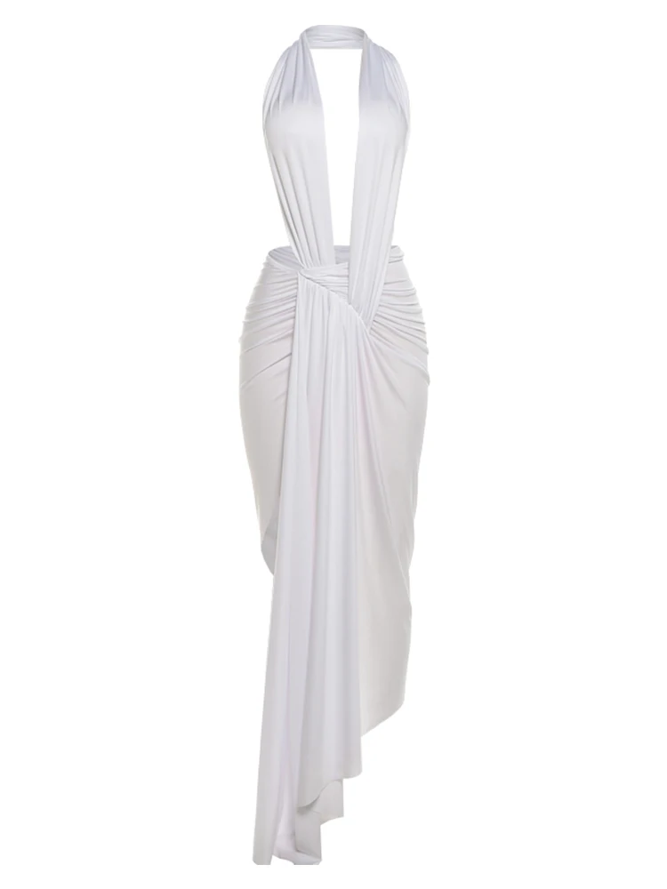 Get ready to turn heads in our stunning backless dress—this halter-style piece features a playful knot ribbon, ruched detail, and daring slits for the ultimate chic statement.