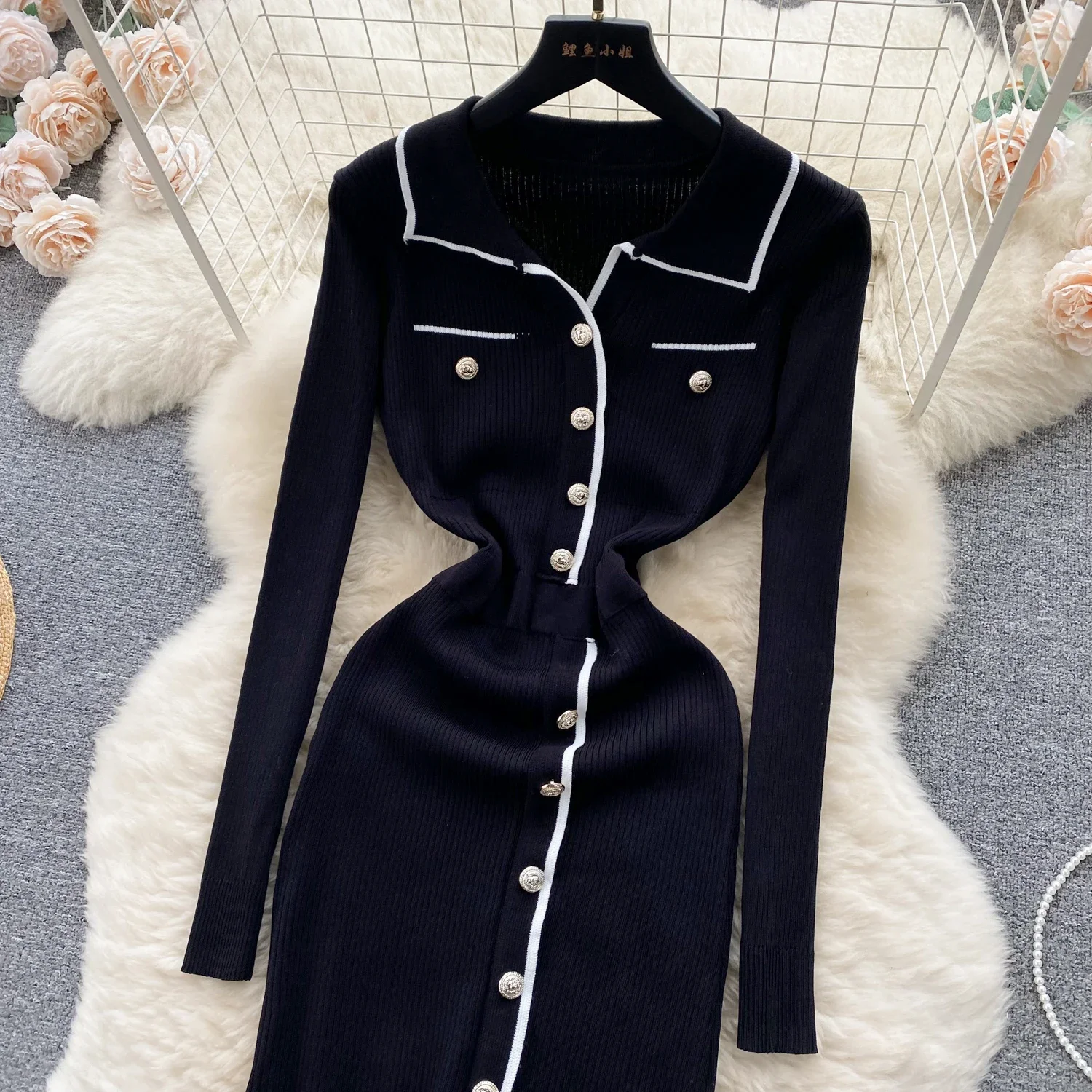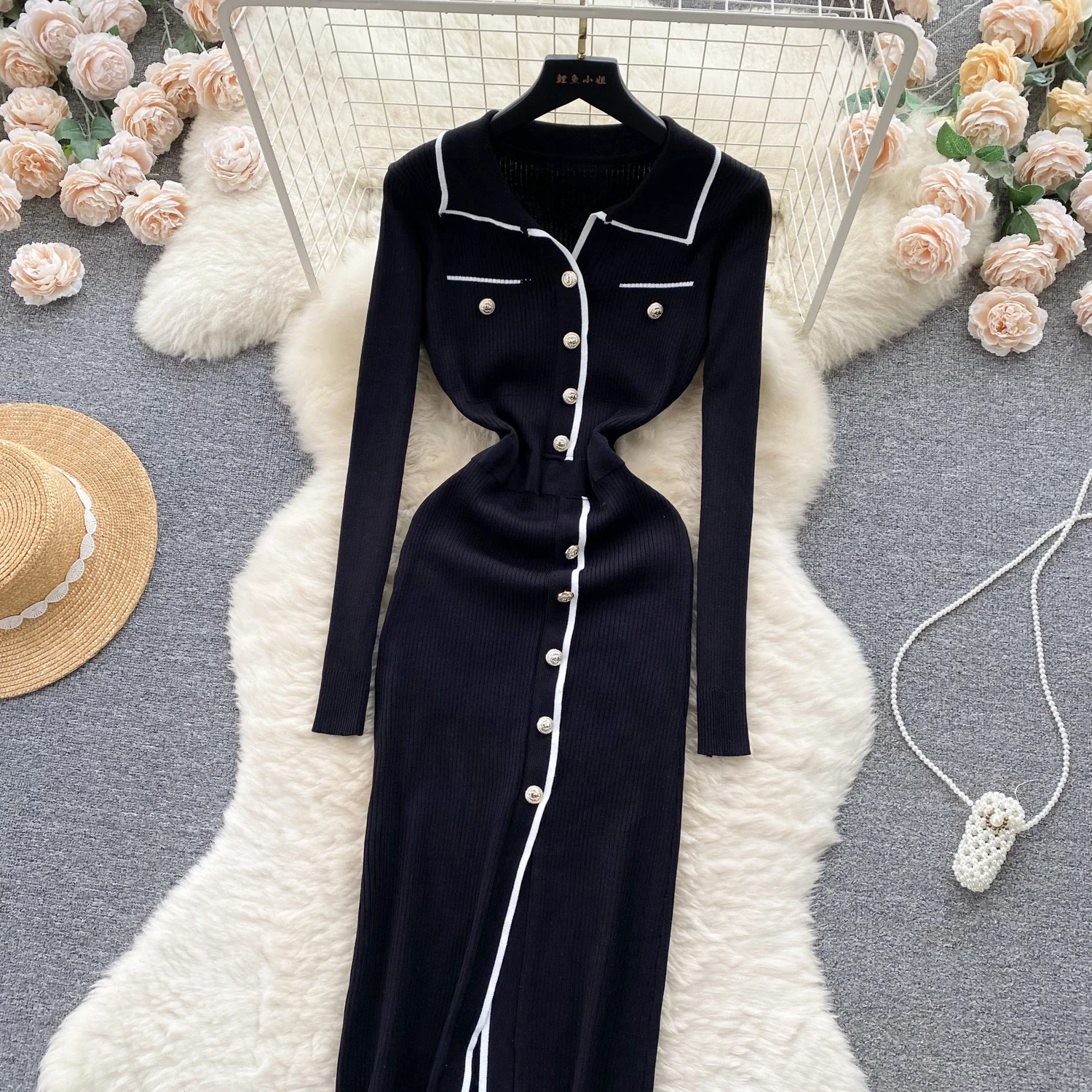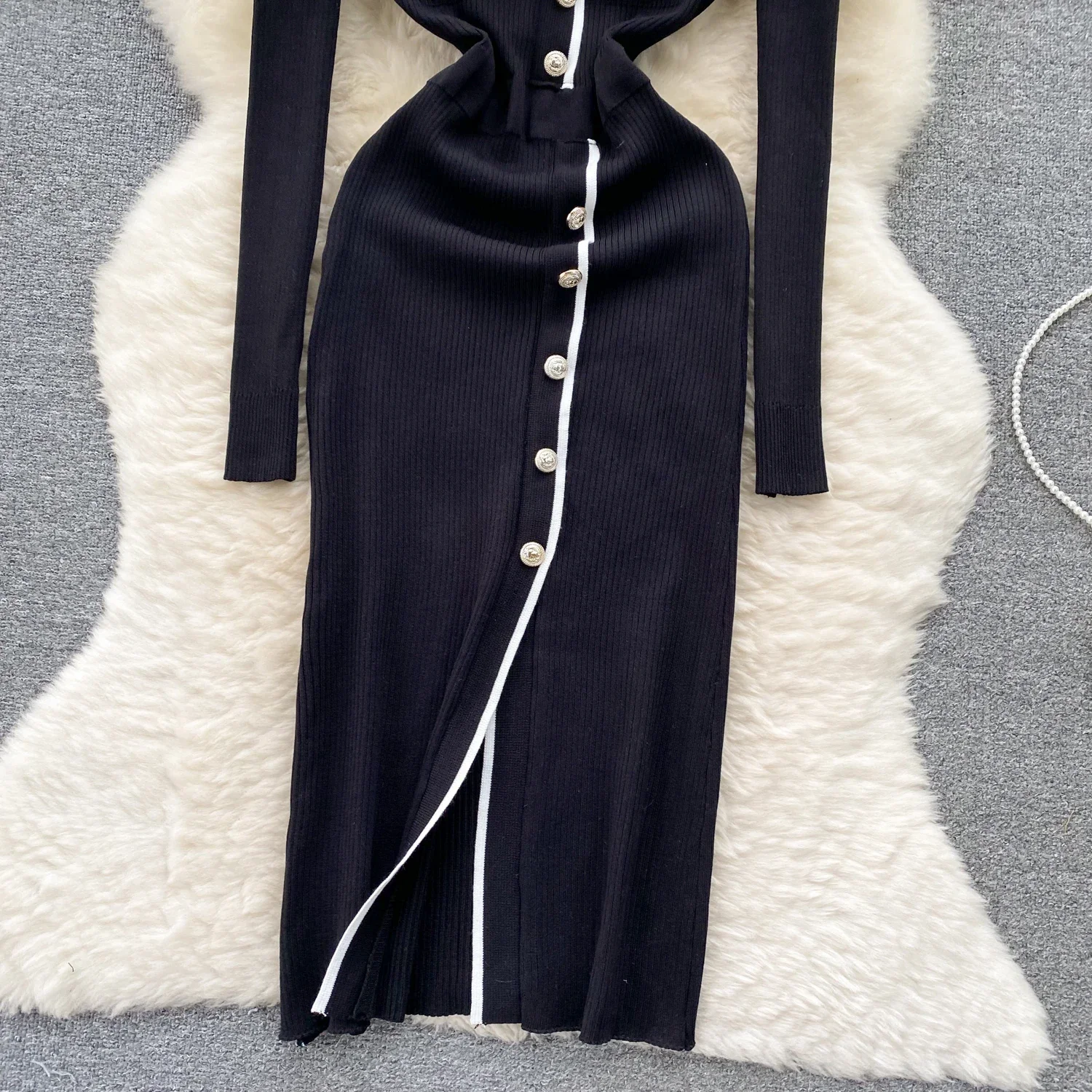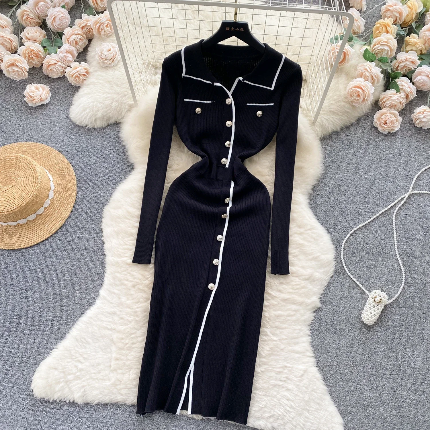 Elevate your look with our black knit sweater dress. This elegant long sleeve midi features a contrast trim polo collar, pearl buttons, and a chic bodycon fit. Shop now.