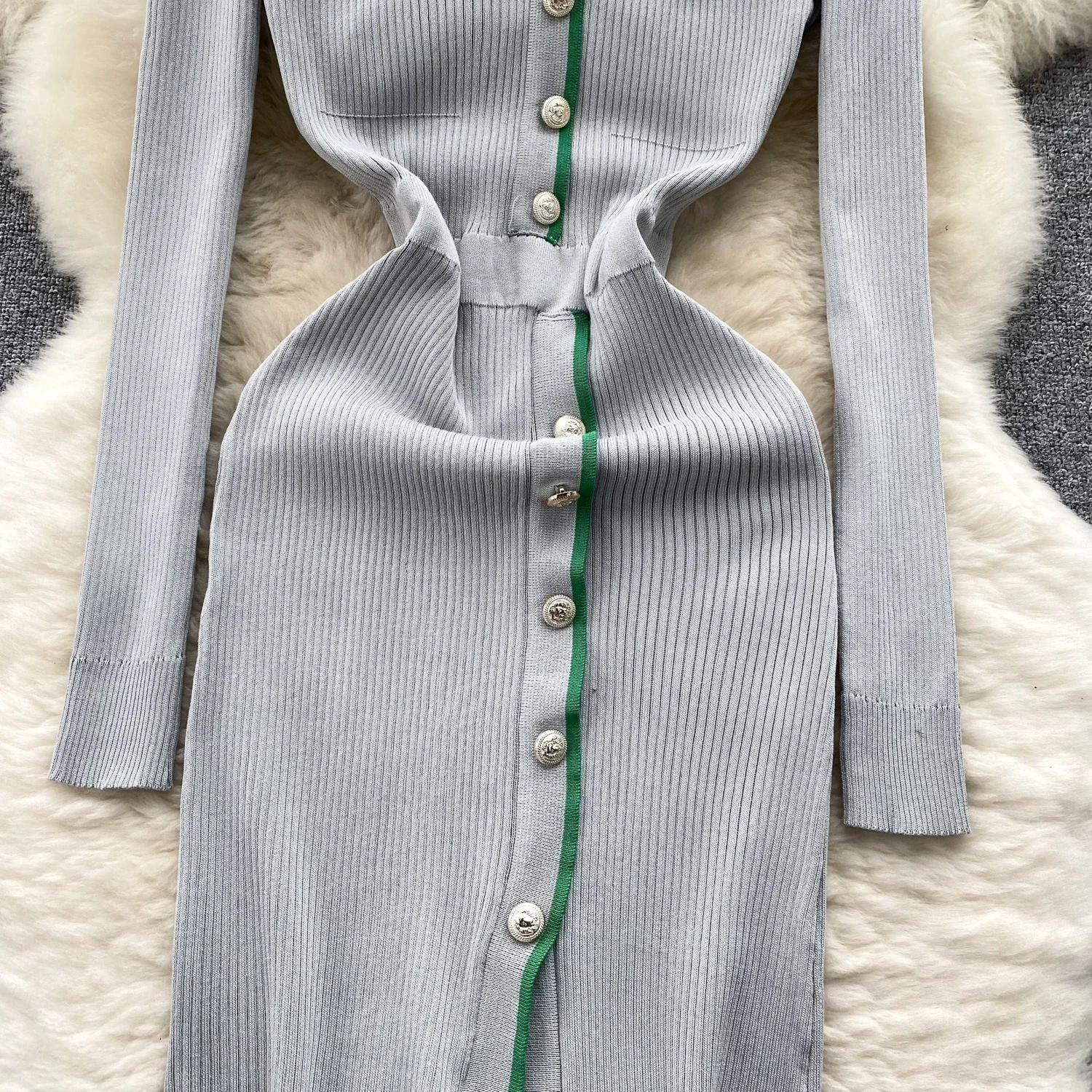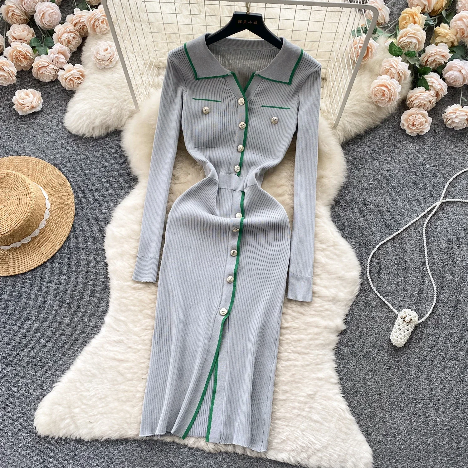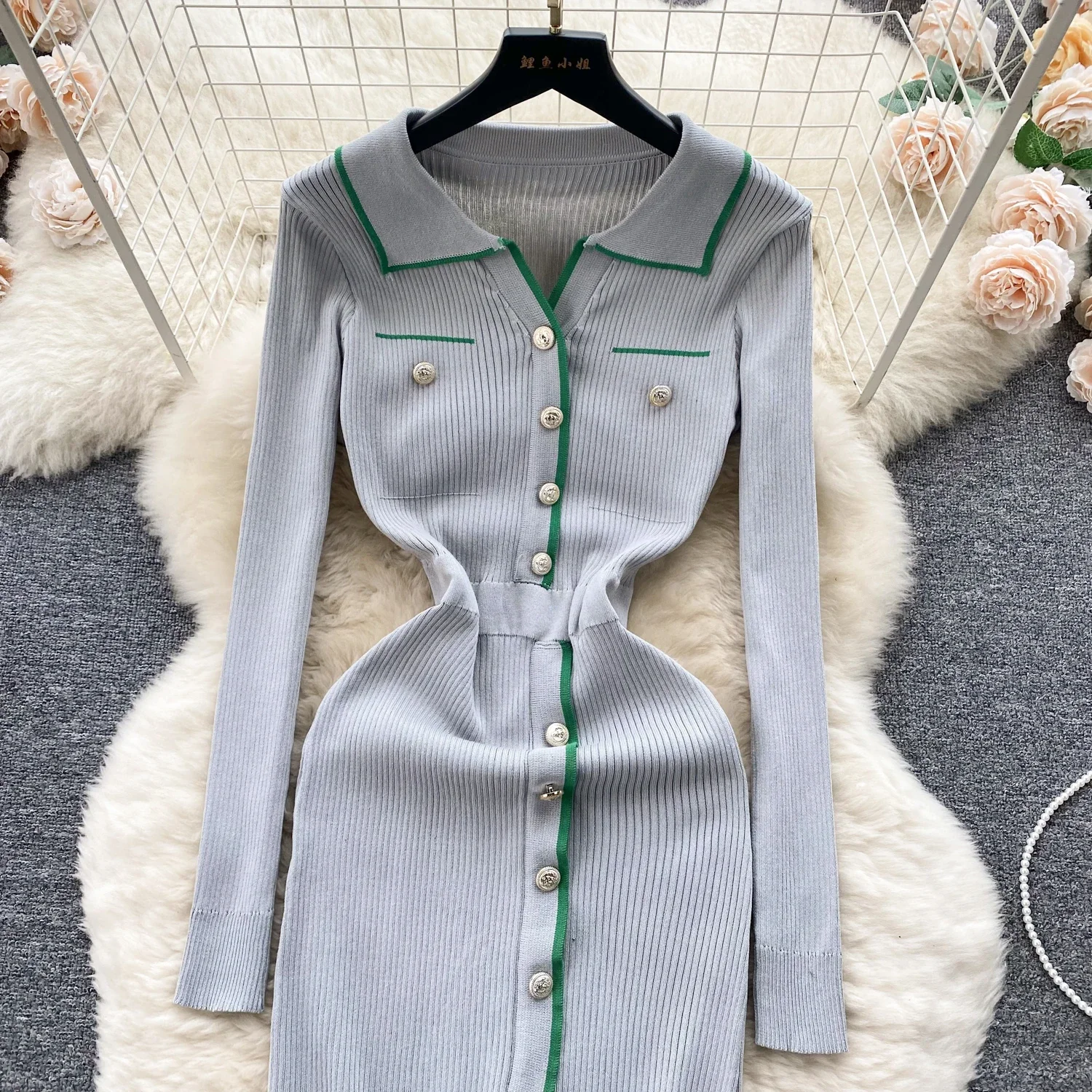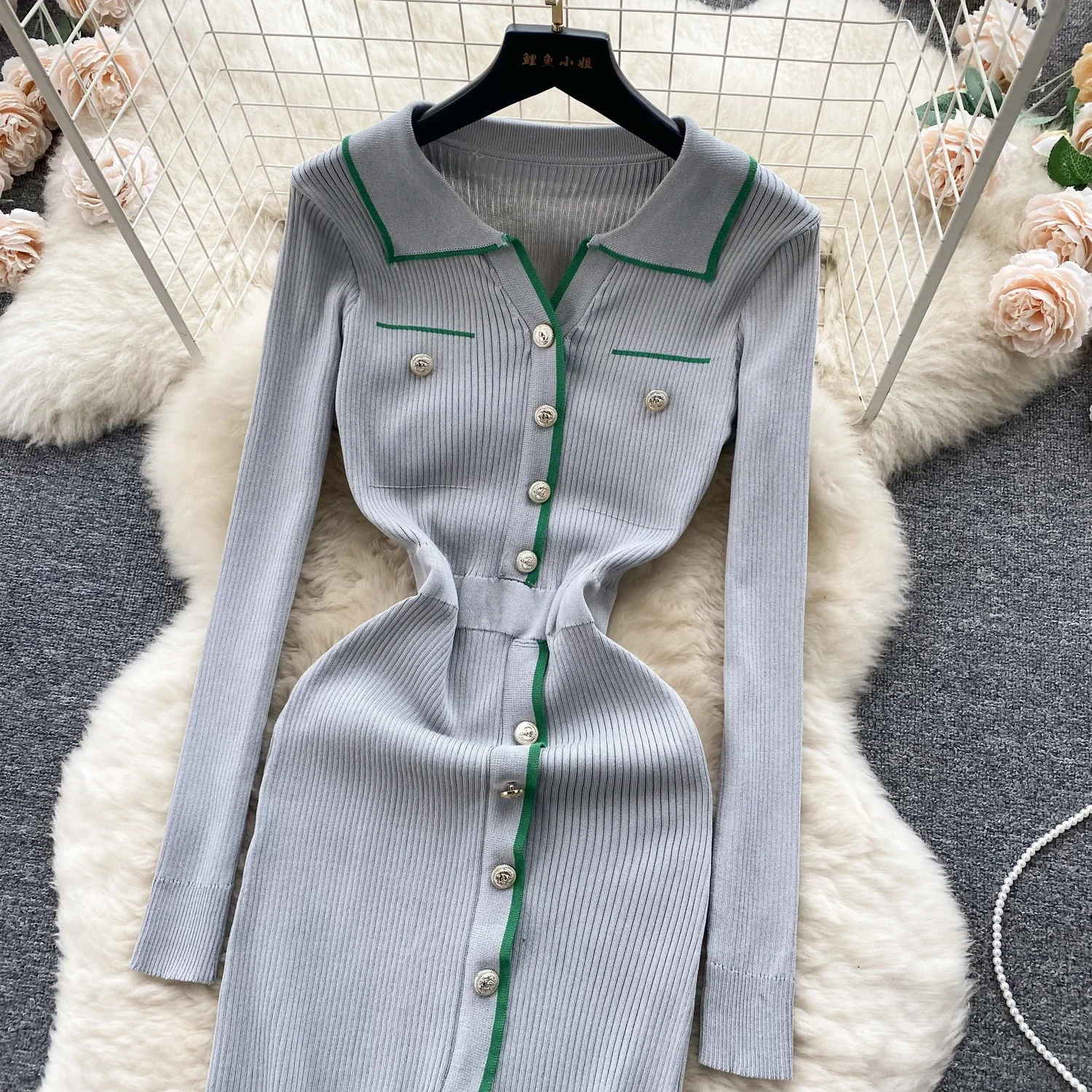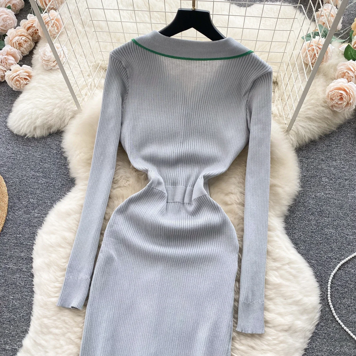 Elevate your look with our black knit sweater dress. This elegant long sleeve midi features a contrast trim polo collar, pearl buttons, and a chic bodycon fit. Shop now.