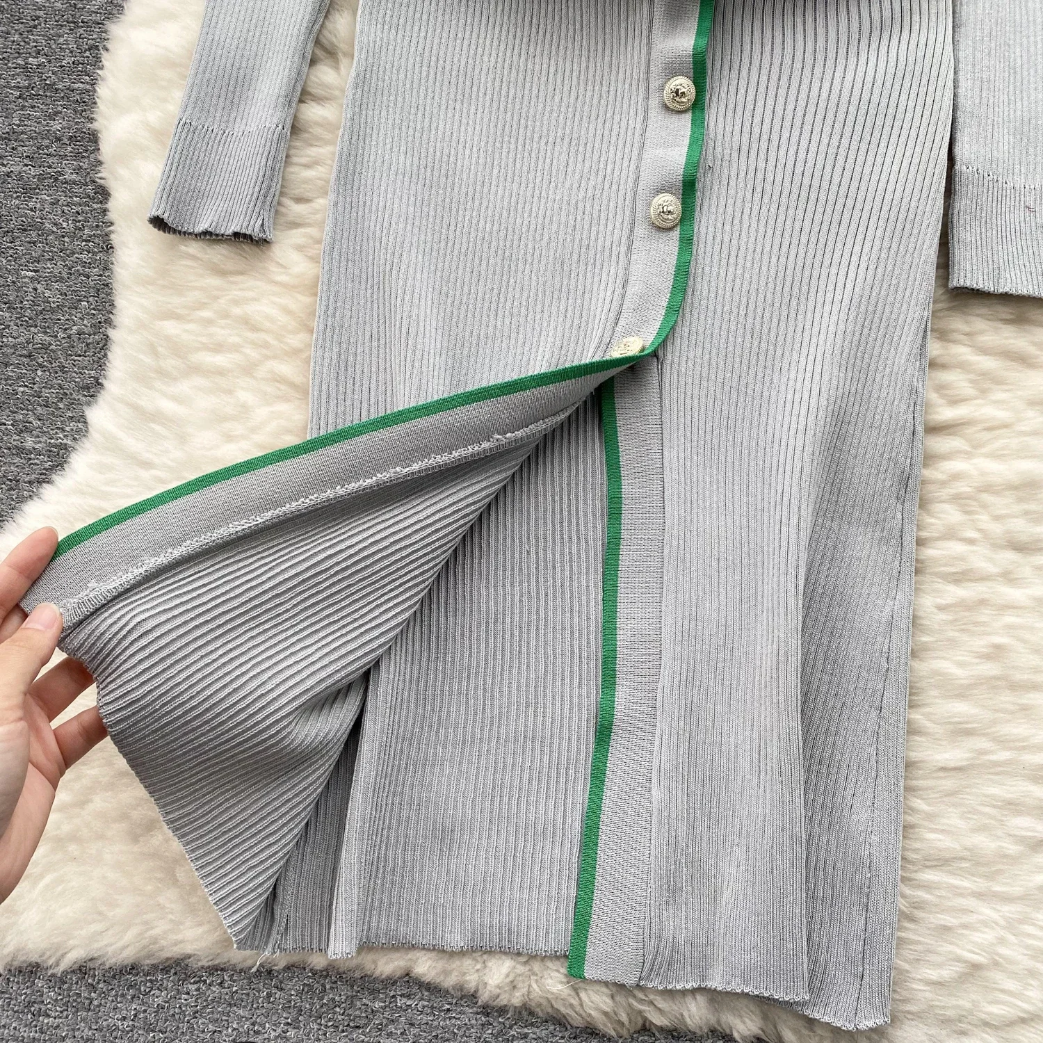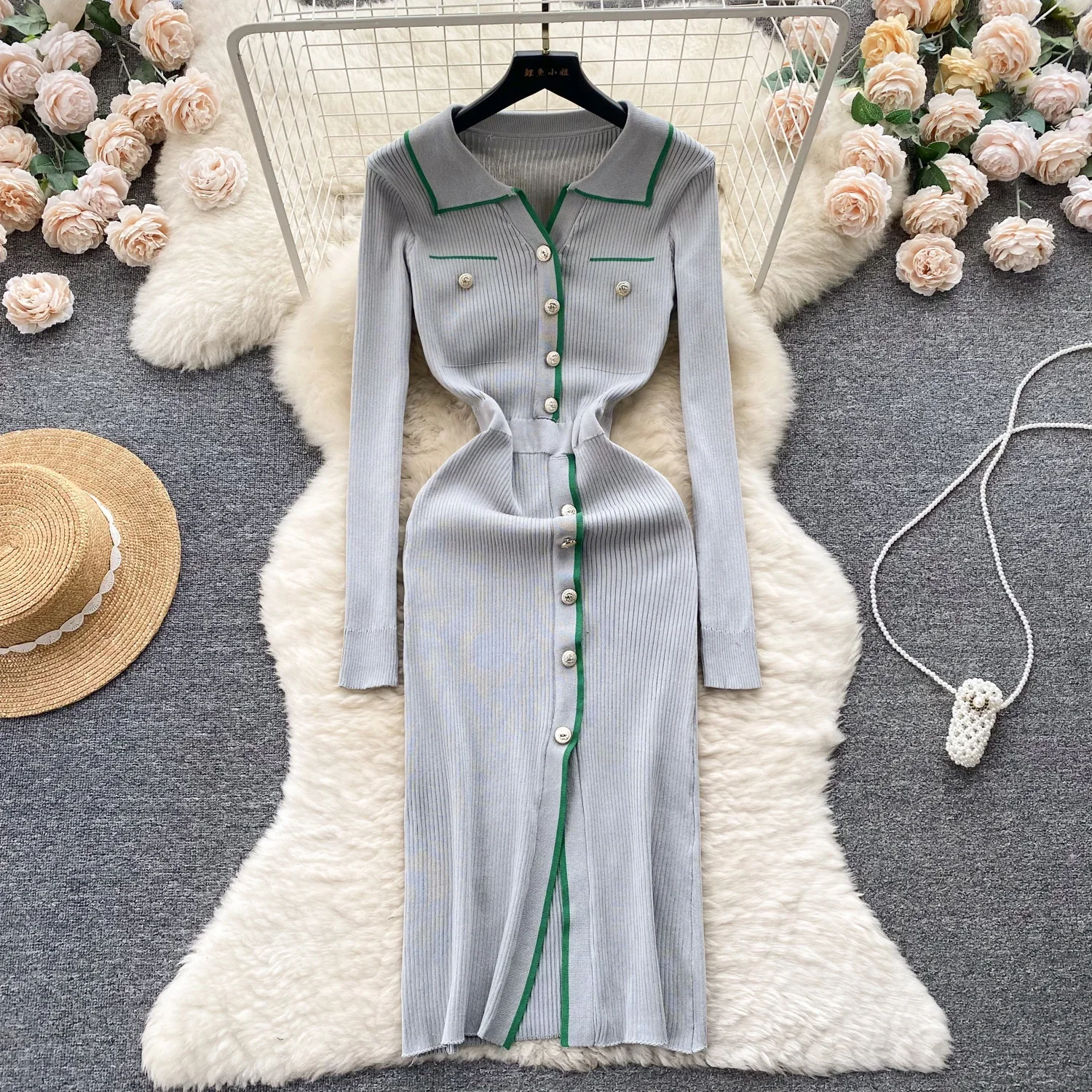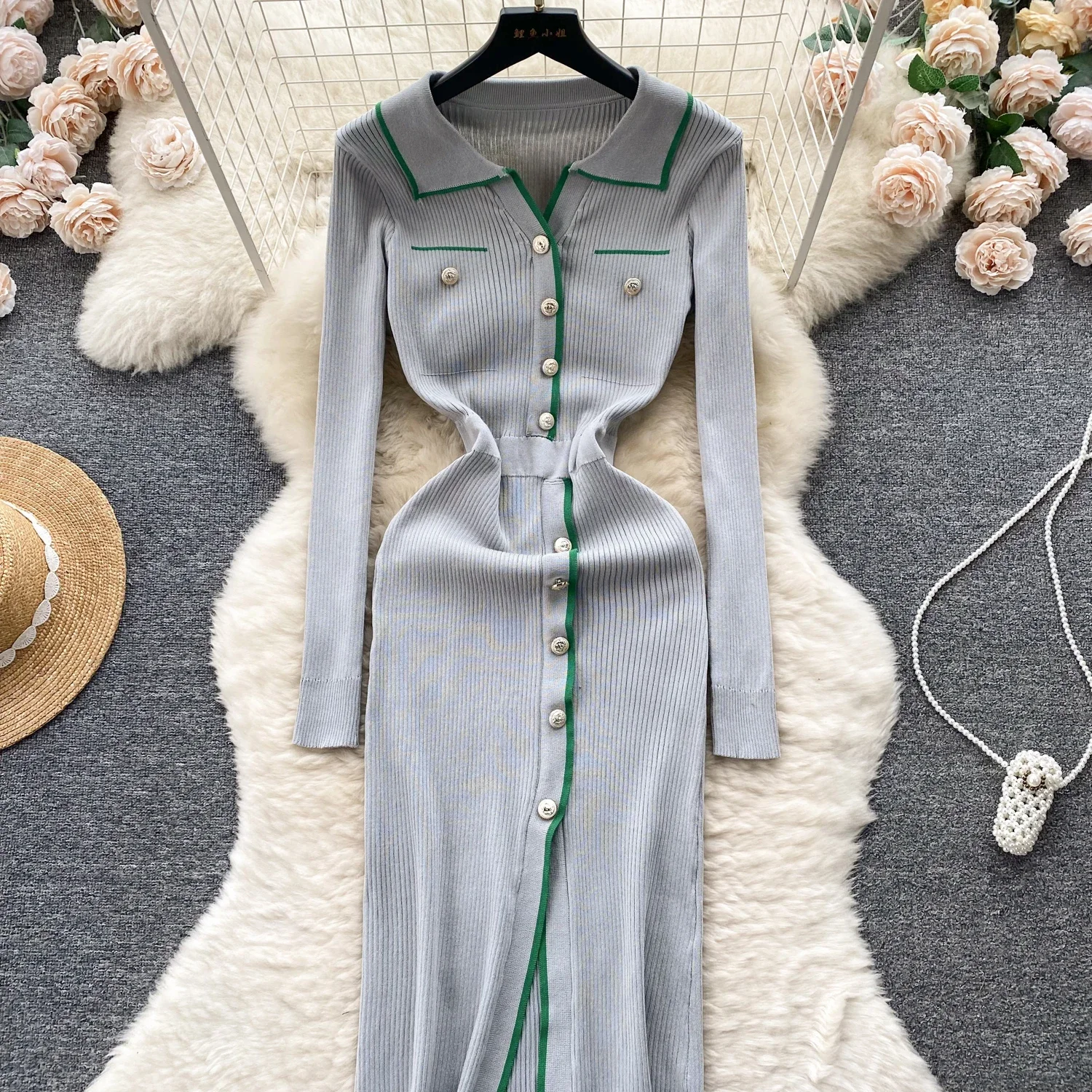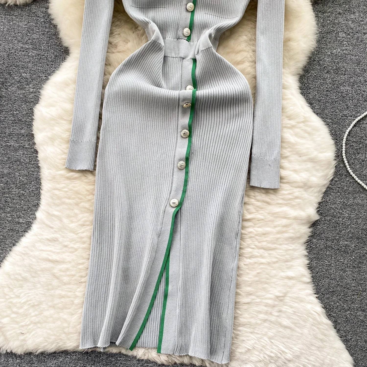Elevate your look with our black knit sweater dress. This elegant long sleeve midi features a contrast trim polo collar, pearl buttons, and a chic bodycon fit. Shop now.
