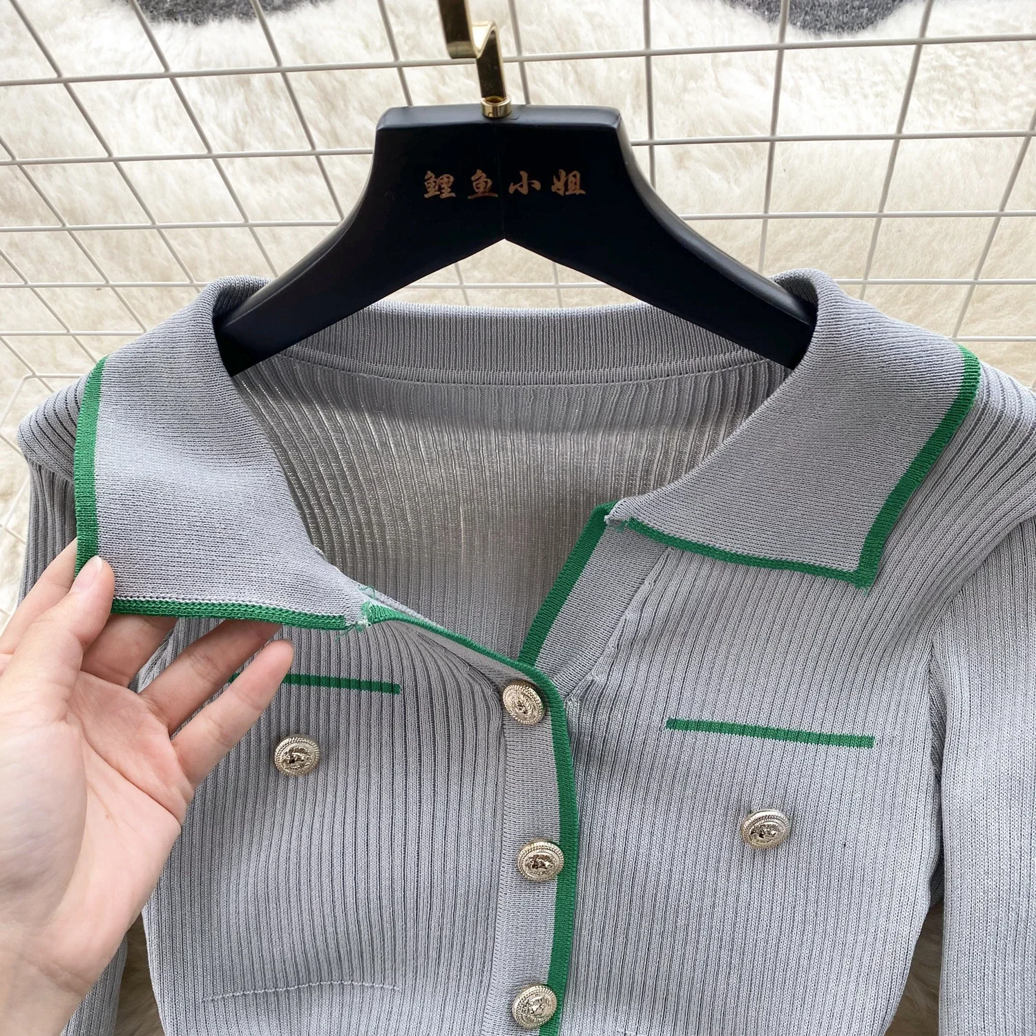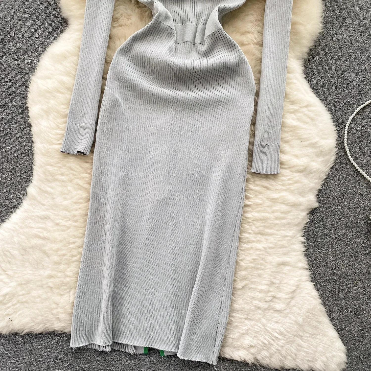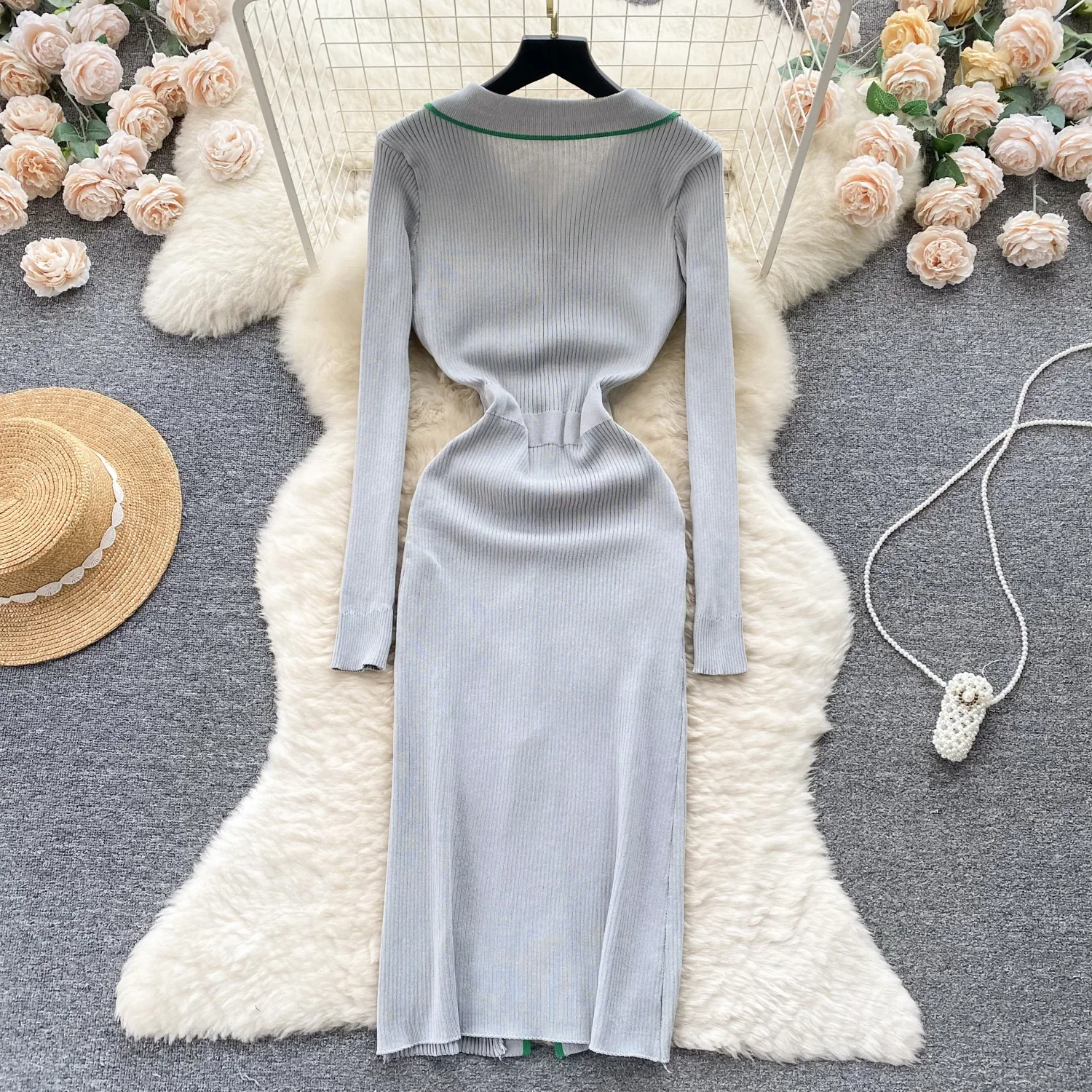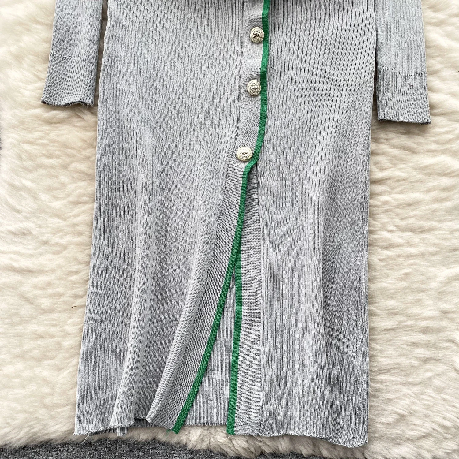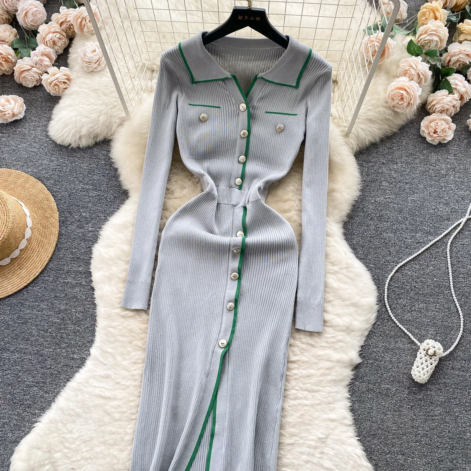 Elevate your look with our black knit sweater dress. This elegant long sleeve midi features a contrast trim polo collar, pearl buttons, and a chic bodycon fit. Shop now.