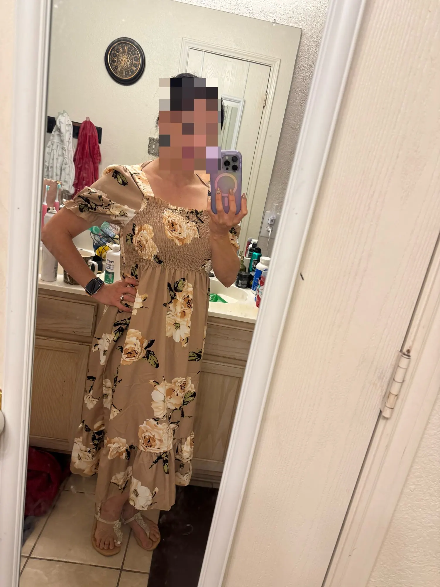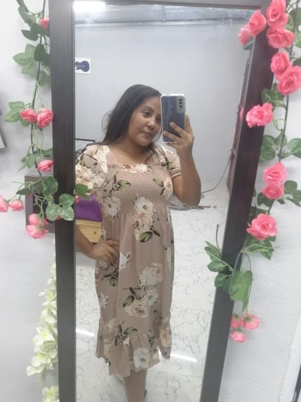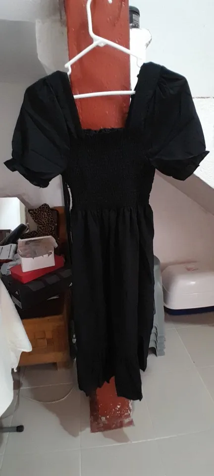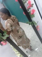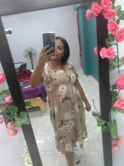 The loose dress is very cute, it doesn’t squeeze, for now it doesn’t show a little more below the knee, I’m normally a size M, the fabric looks comfortable, I just tried it on.