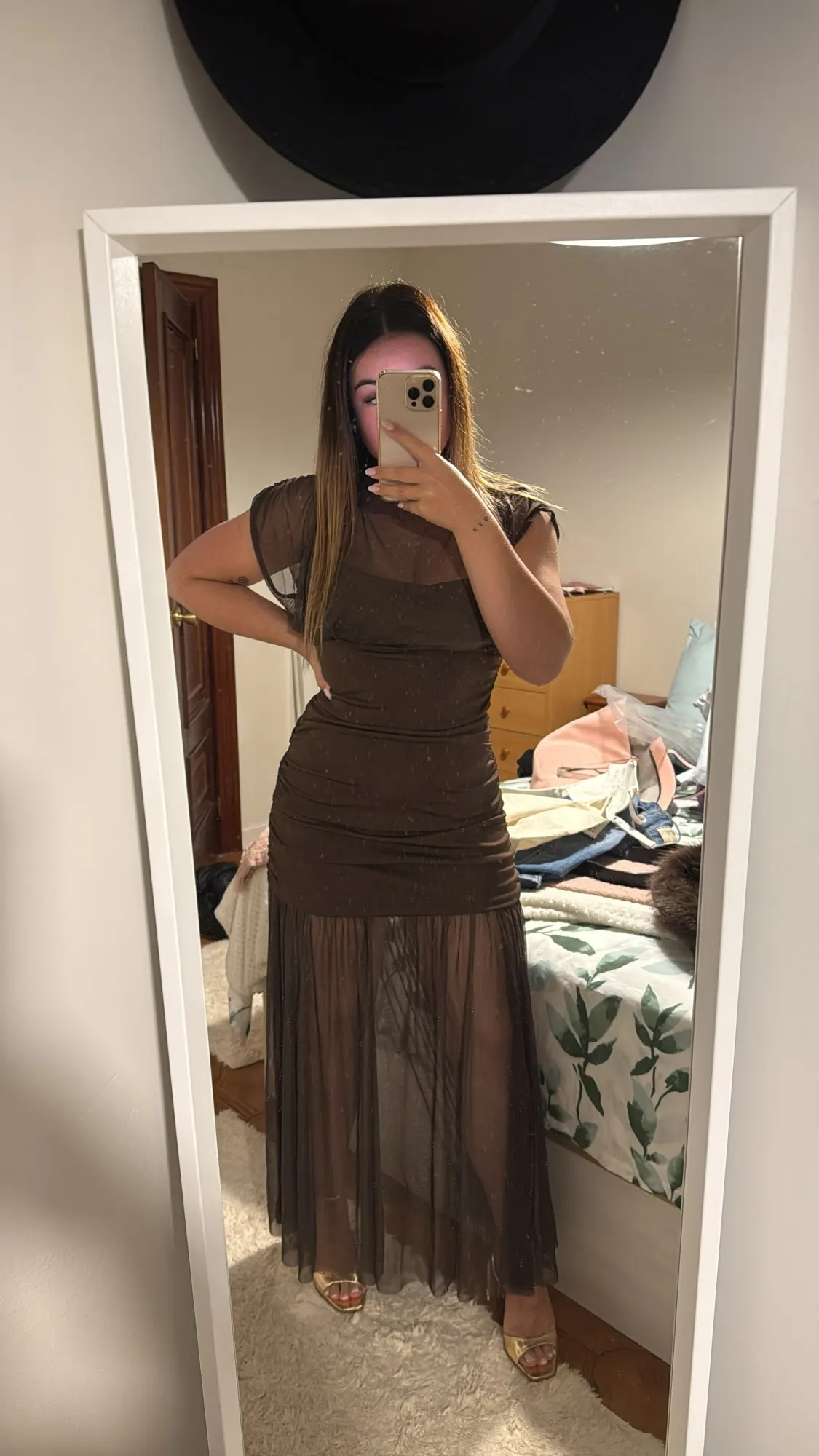 Magnificent girls🤎🤎🤎 she is really like the Zara brand regarding the size. Personally, I wanted it to be fitted around the waist. I took an S even though I wear an M, and it fits just right (a bit too tight around the chest). I feel like the cotton material is shorter at the thigh level, but there’s a kind of effect that locks the material so it doesn’t ride up with the transparent side at the strap level. You can adjust it, so it’s really perfect.