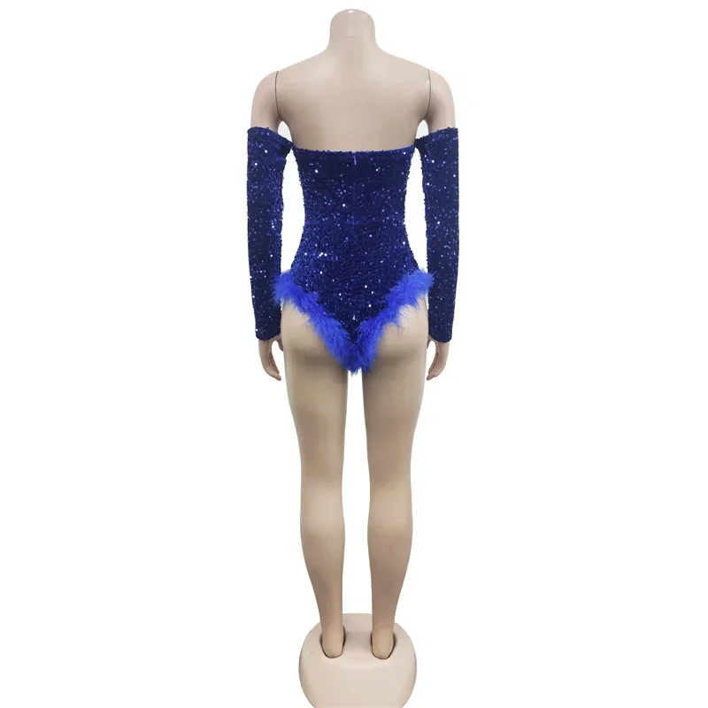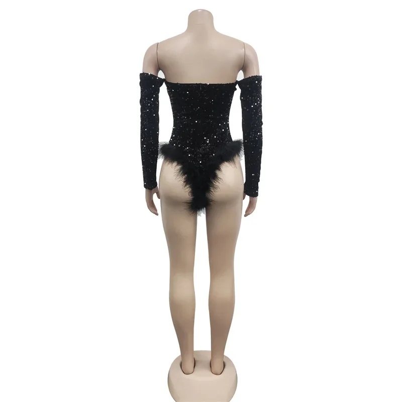 Elevate your style with the Feather Jumpsuit—sequined splices and a backless, slim-fit design that turns heads wherever you go.