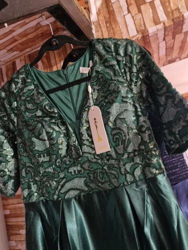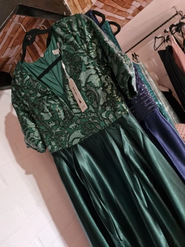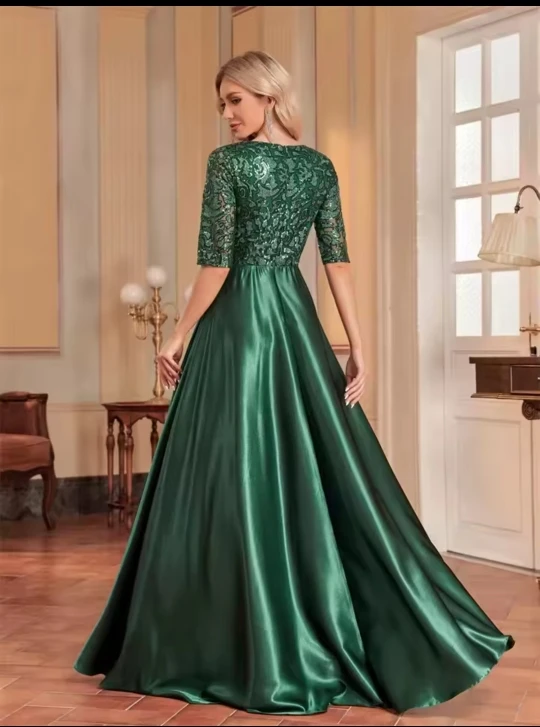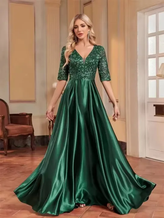 Slip into sparkle with our green satin evening dress—short sleeves, shimmering sequins, and a floor‑length V‑neck that turns heads at every event.