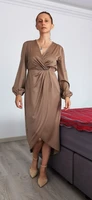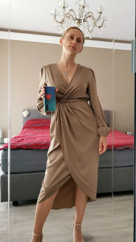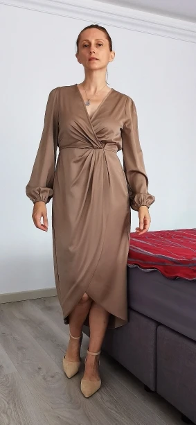 The dress is synthetic. well sewn. There is no smell. The color is like in the picture – cappuccino.