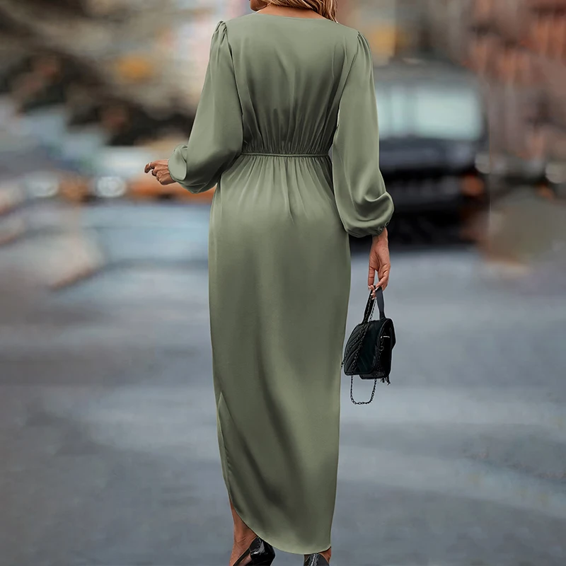 Maxi Satin Dress – Silk V-Neck, Long Sleeve, Versatile Evening & Office