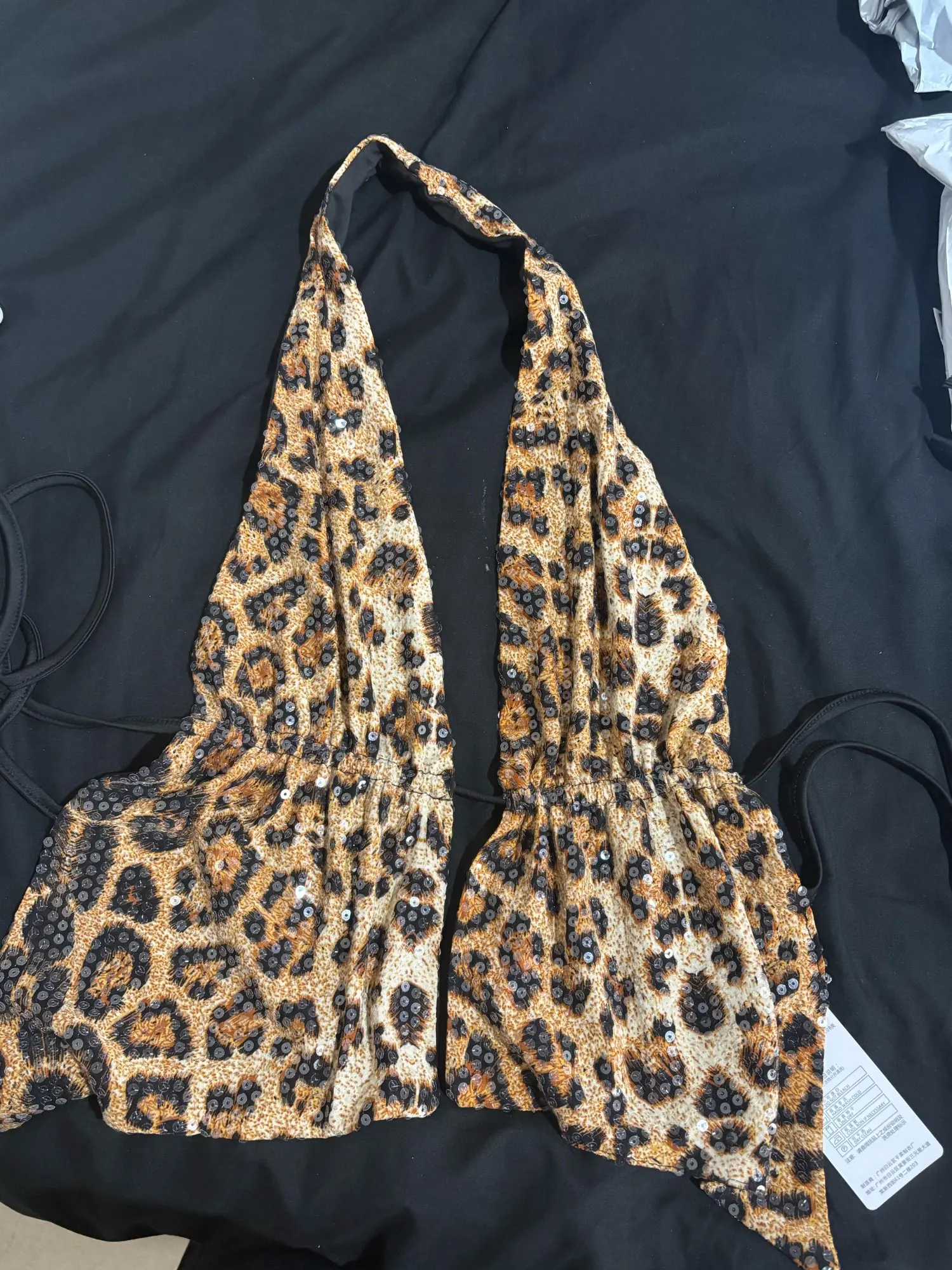 I wish i got the biggest size, i got a medium and as a 36d it barely holds my boobs together, the fabric is adjustable and stretchy so u can cover everything still but it won’t give the rouche effect like in the pic so i recommend sizing up if u have a bigger chest (i’m 36d for reference). Also u can’t rlly see it in the pic but there is transparent sequins all over the top so it depends on if u into that (i thought it was just leopard print)