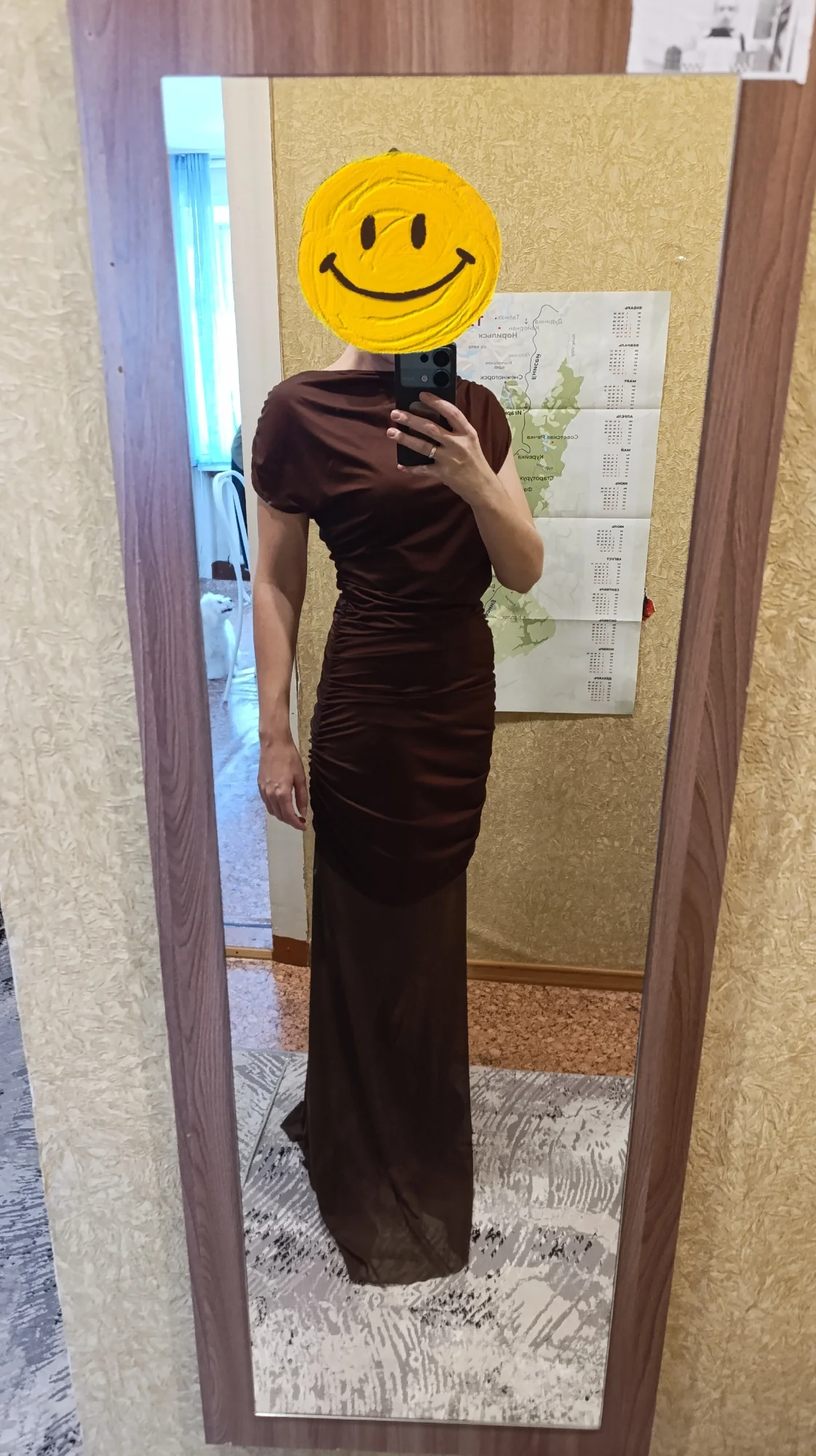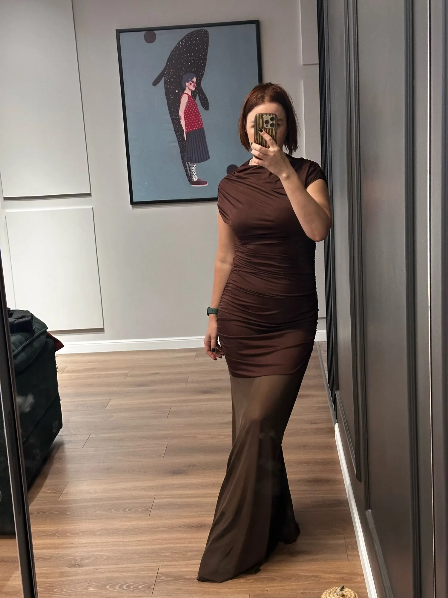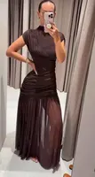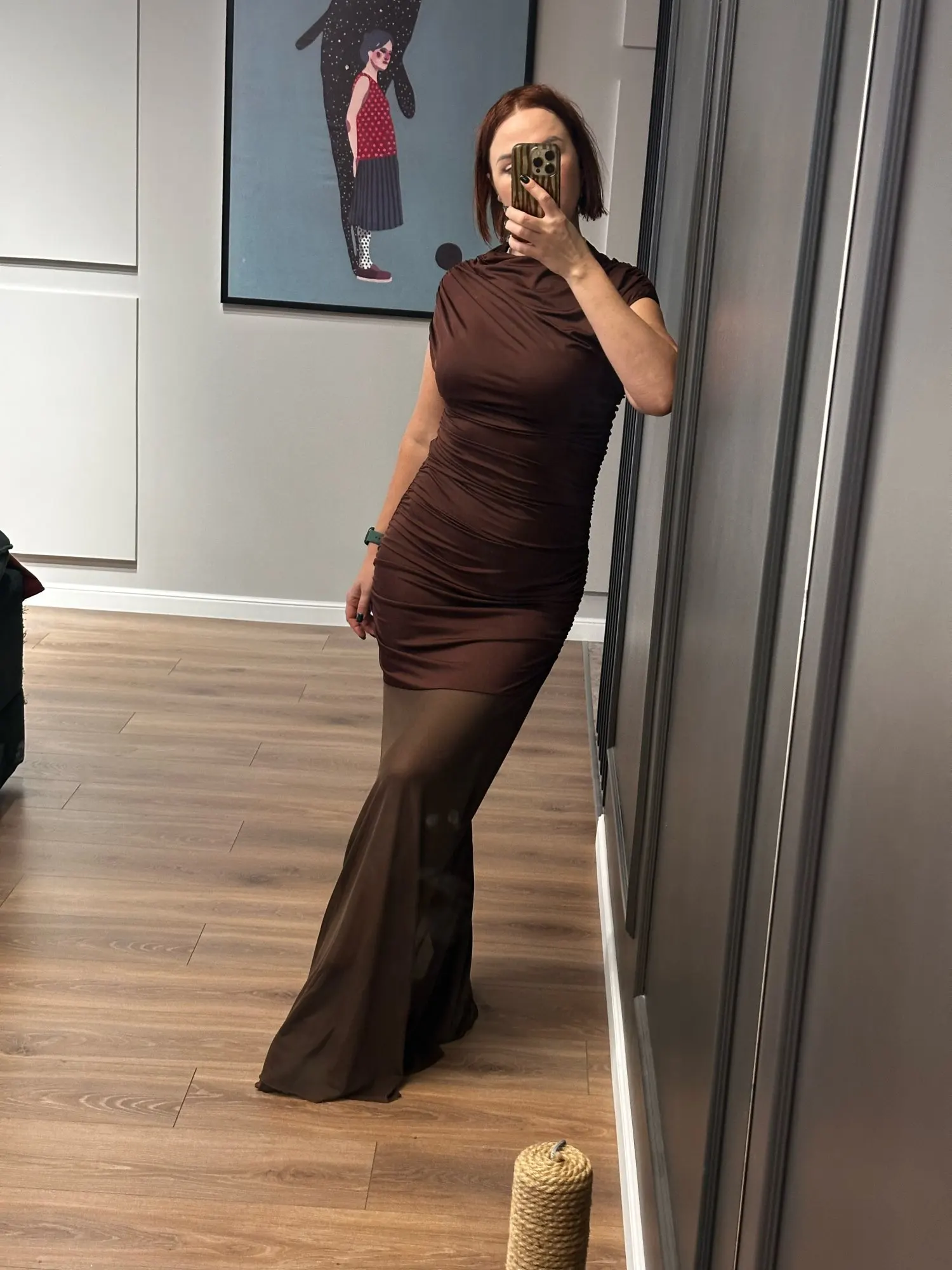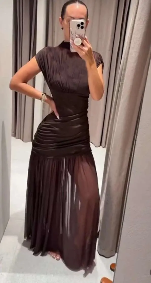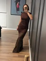 12 reviews for Ruched Mesh Dress – Sleeveless Max with Coffee‑Color Neck