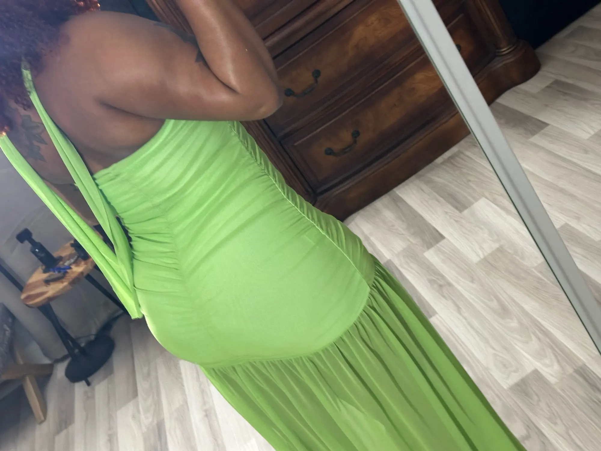 6 reviews for See Through Hem Dress – Ruched Halter Backless Maxi