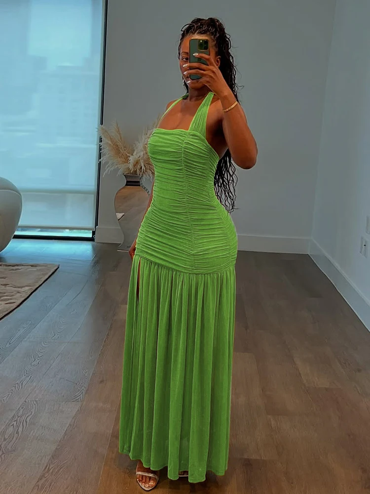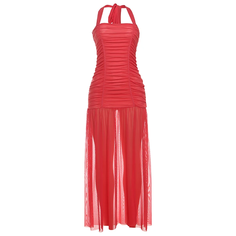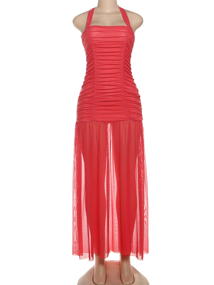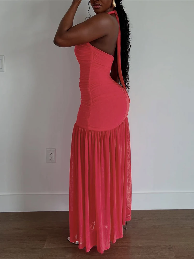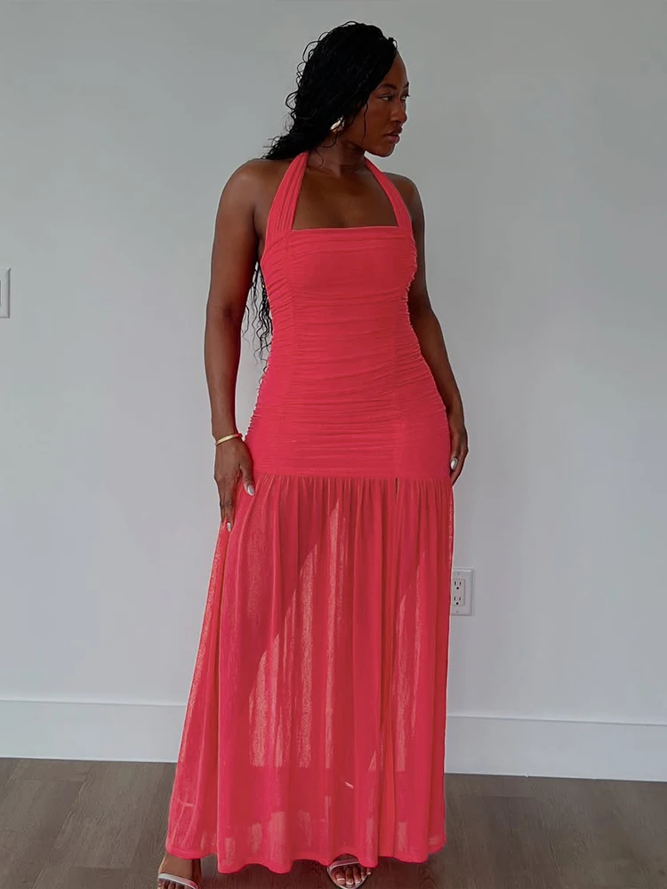 Step out in style with our see-through hem dress—a ruched halter backless maxi that turns heads and feels as light as air. Perfect for any occasion where you want to show a little shimmer while staying chic.
