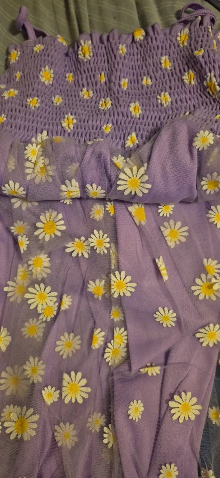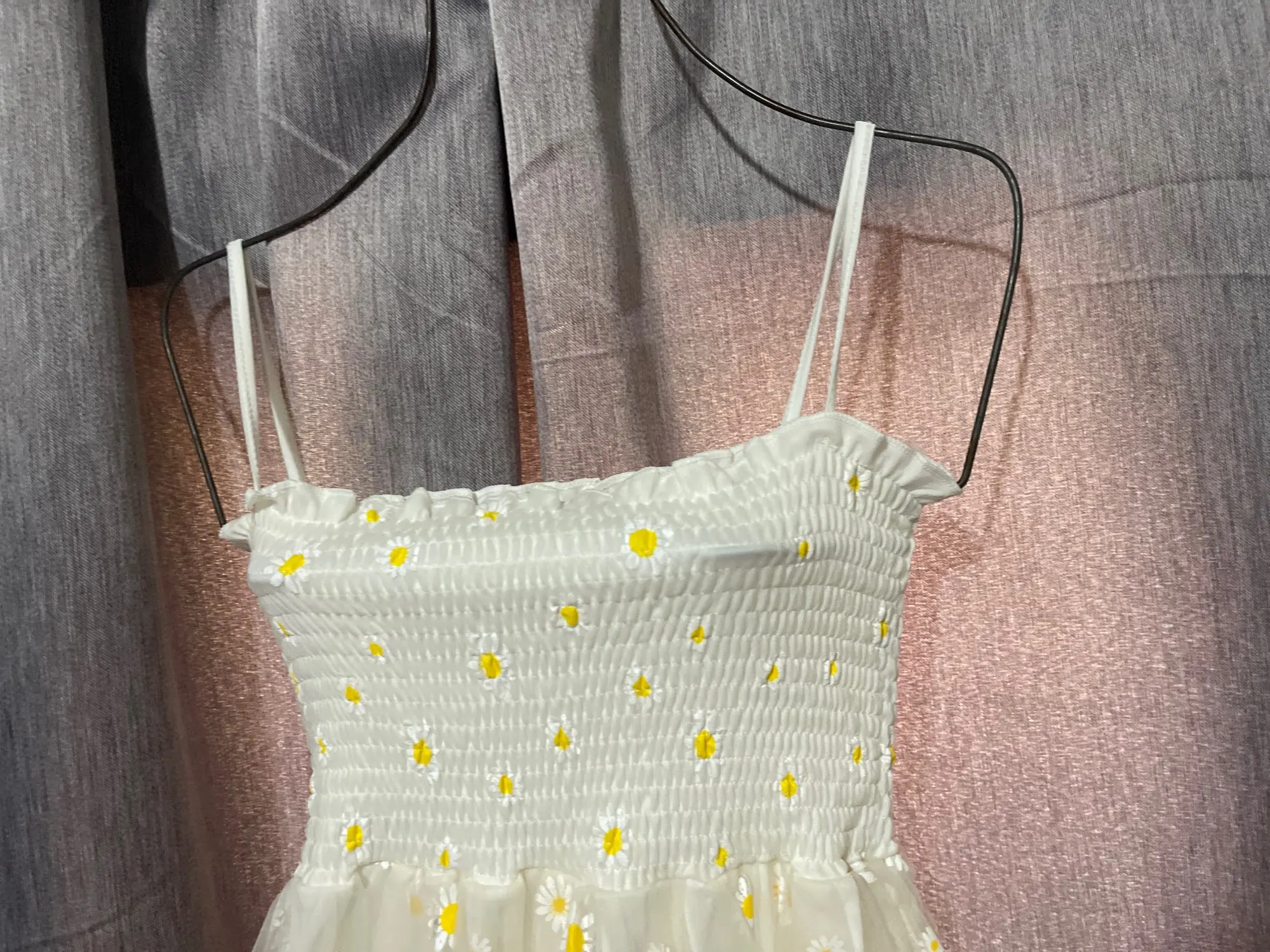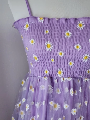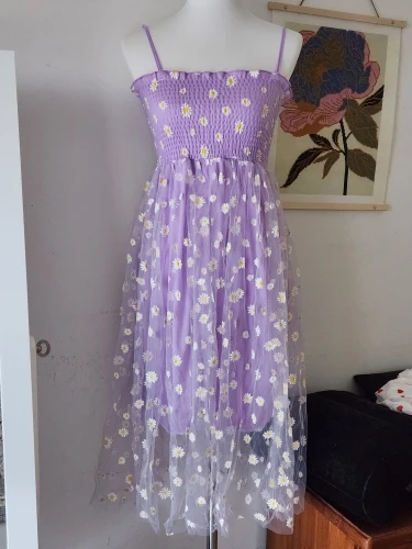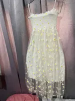 Enjoy the beach in style—our Two Layers Mesh Daisy Flower Dress fits comfortably (One Size, chest 50 cm, length 103 cm) and features charming straps for a breezy vacation look.