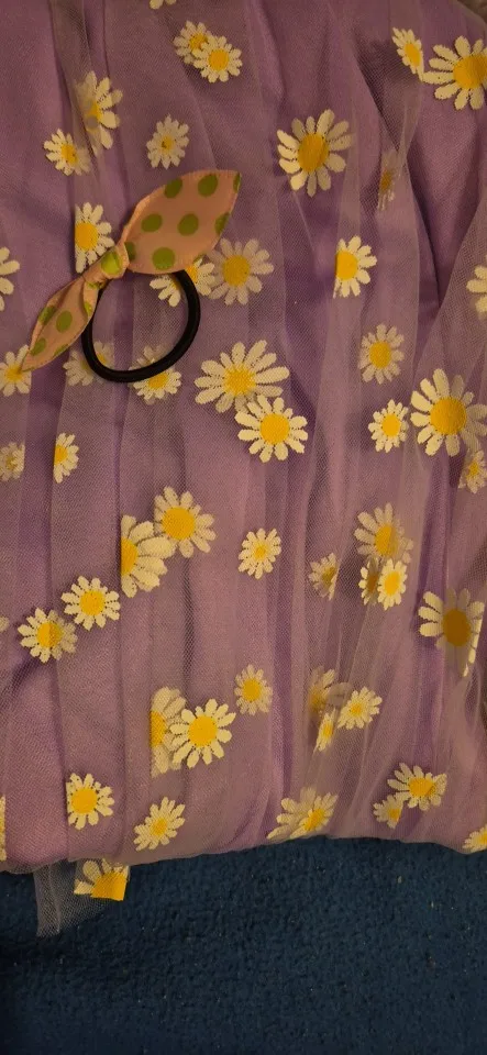 Very beautiful dress. The colors are so pretty! I really love it. And it came with a cute little bonus hair tie.