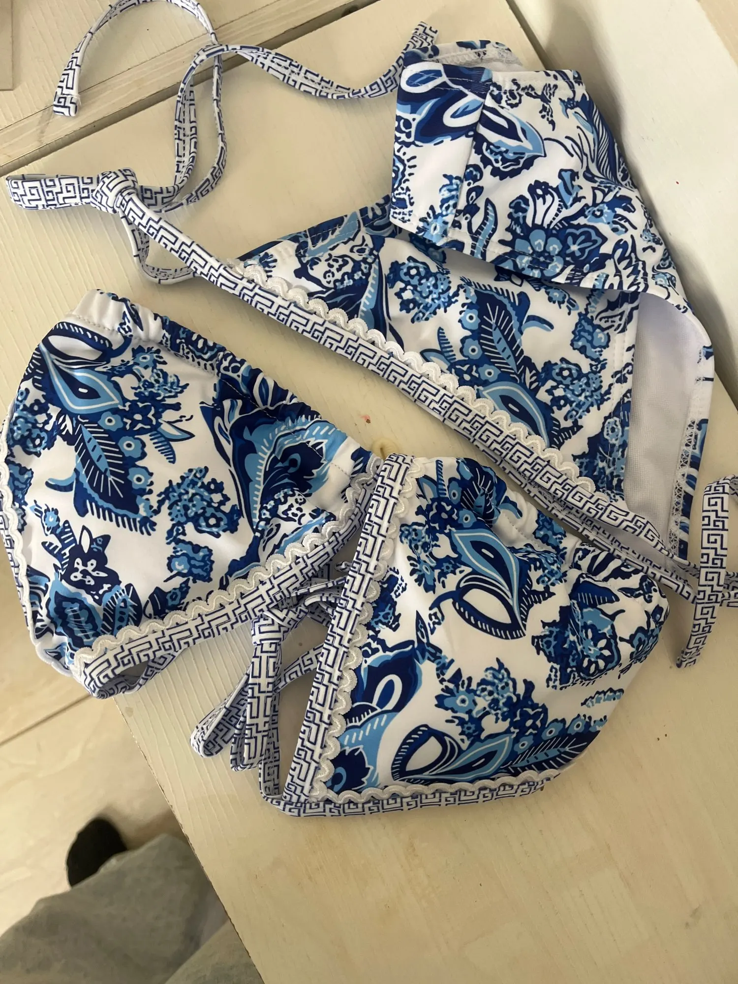 The bikini is beautiful. It looks exactly as pictured, but is slightly bigger on me, especially the botton. My measurements are 94-79-103cm. Next time, i’ll buy size m.