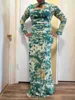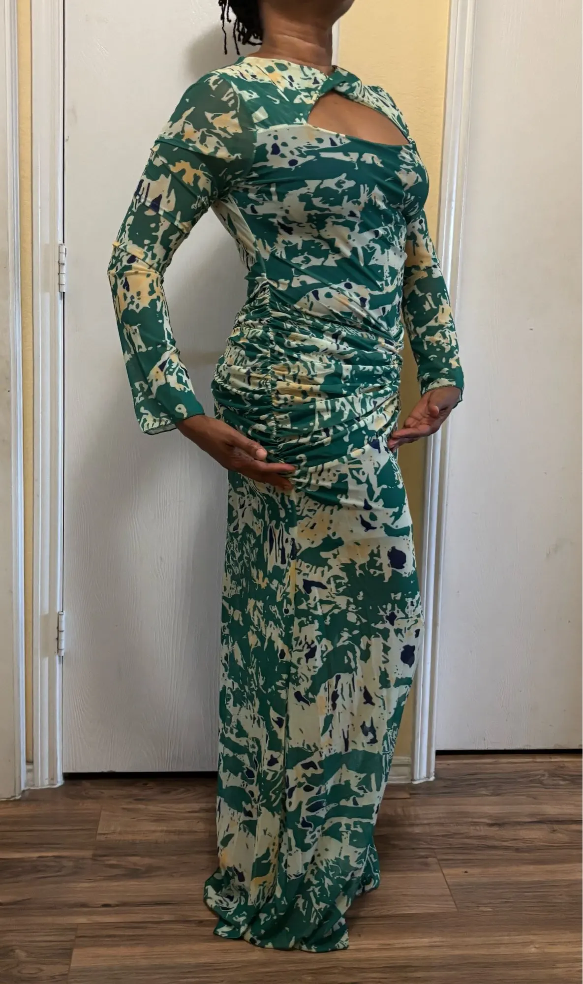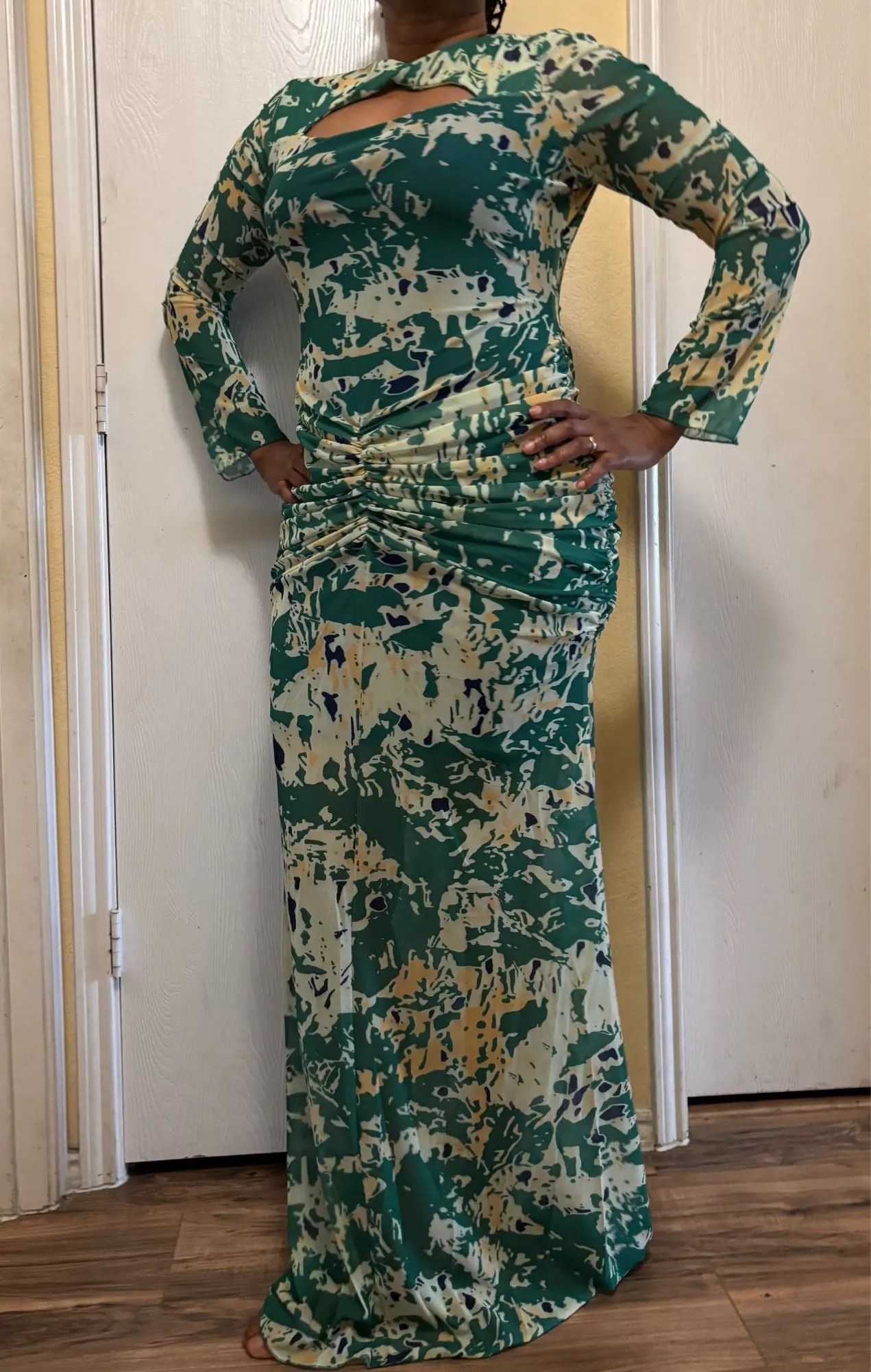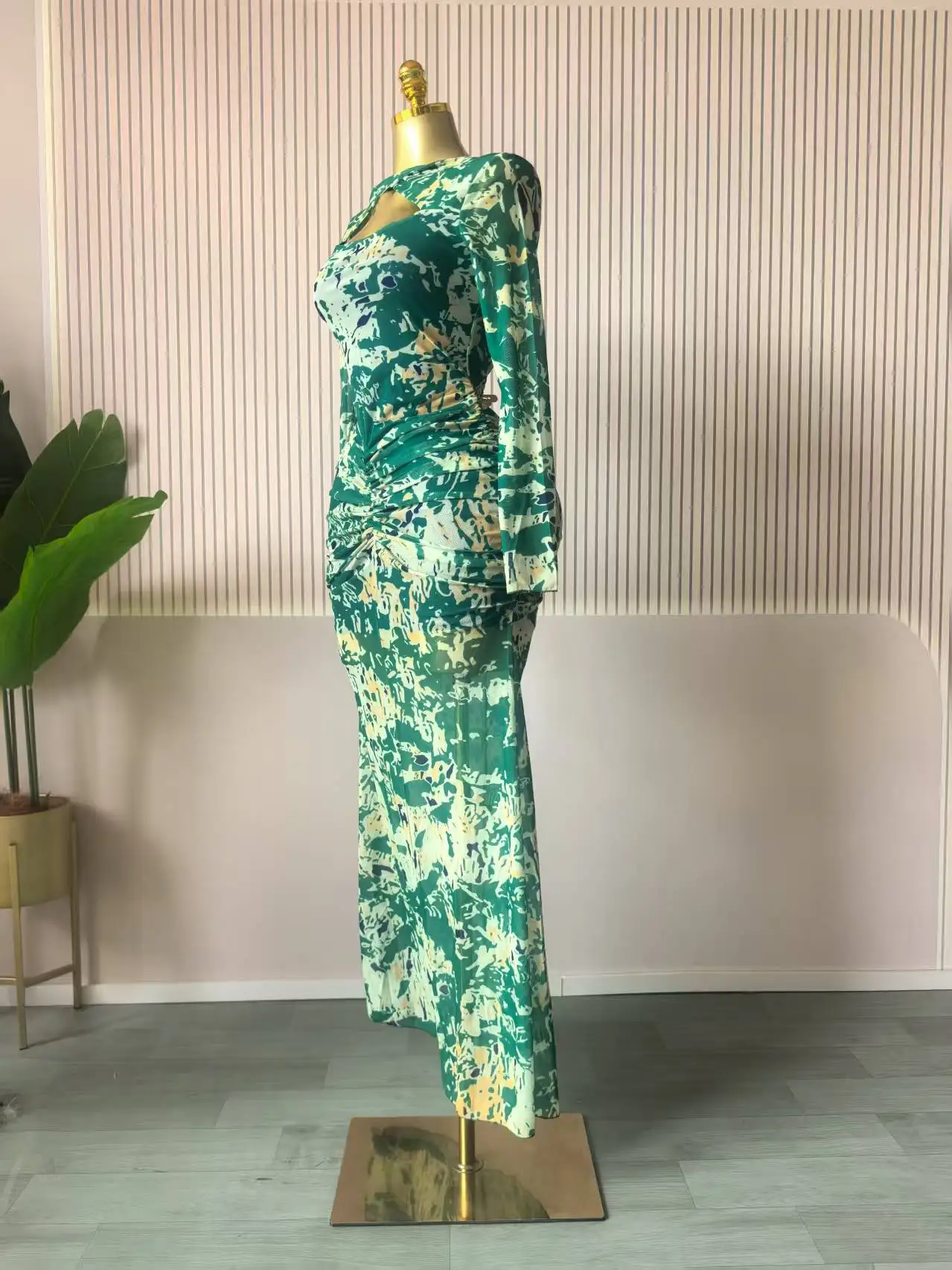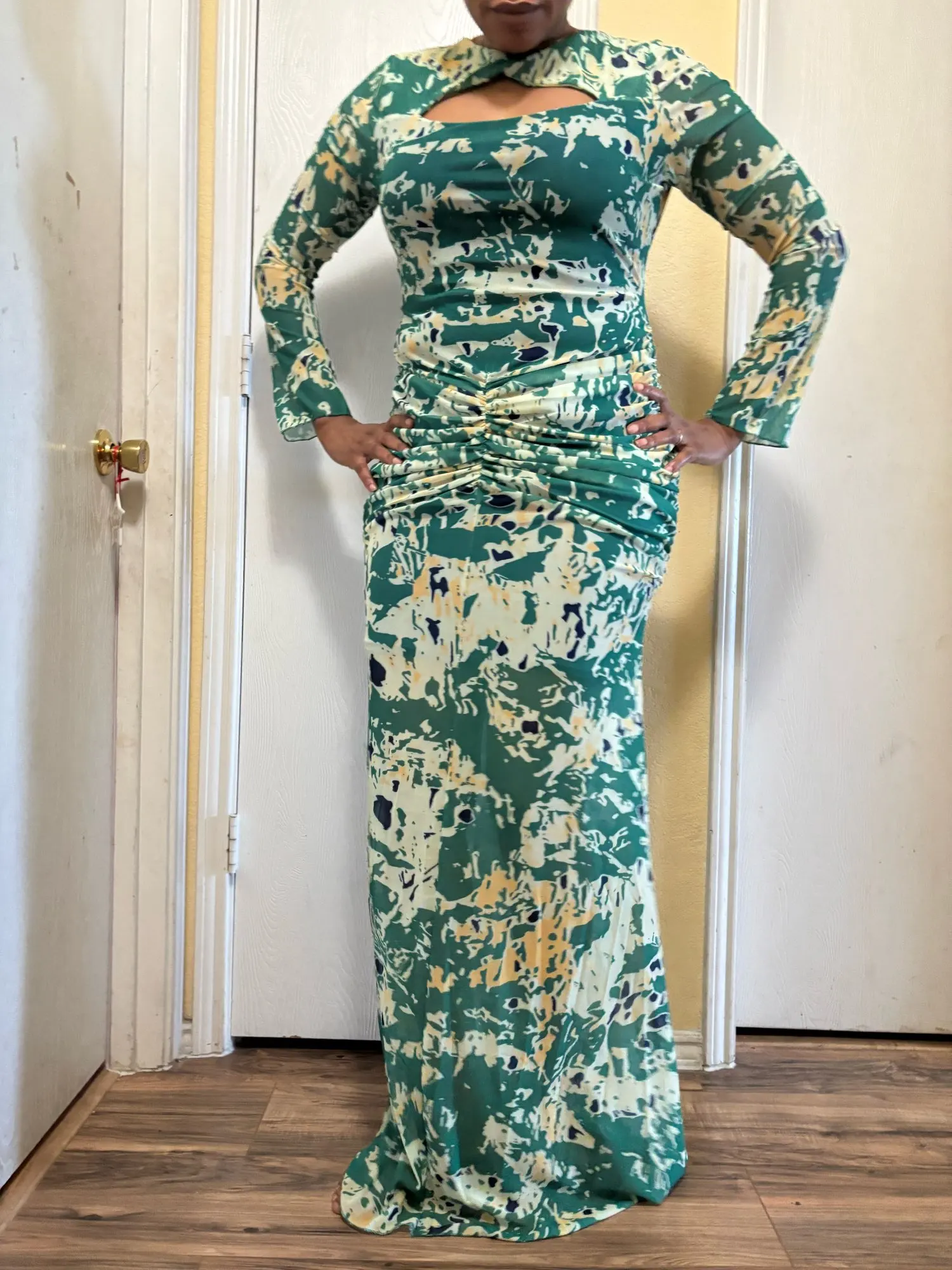 Get ready to turn heads with our V‑neck cutout front dress by CM.YAYA—sleekly ruched for a bodycon silhouette that flows from midi to maxi. This stylish piece blends daring cutouts with timeless elegance, making every moment unforgettable.