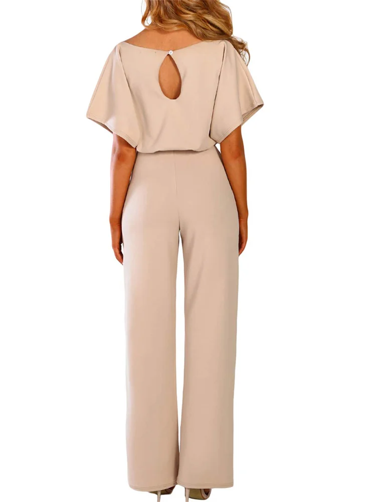 Women Jumpsuit, Elegant Short Sleeve Hollowed Waist Tie Solid Summer Wide Leg Pants