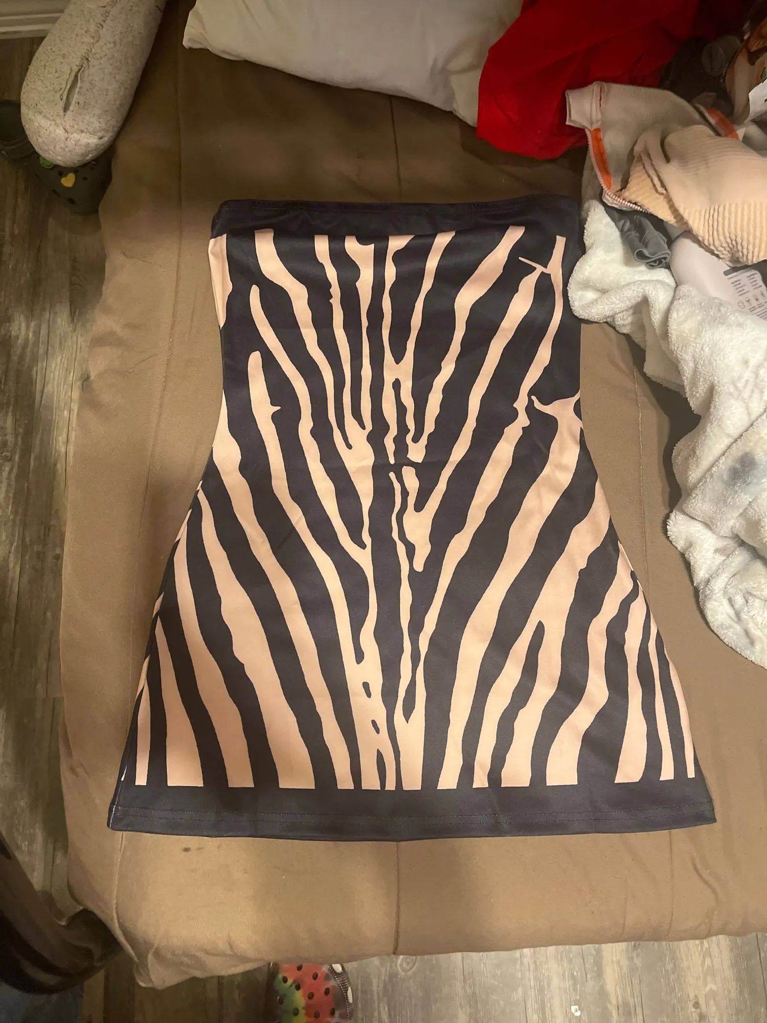 Step out in style with our Zebra Printed Dress—strapless, backless, and ultra-short for a bold A‑line look that turns heads wherever you go.
